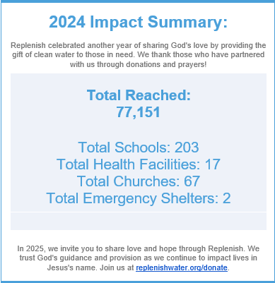 Replenish exists for both the global and domestic communities. While Replenish serves the global community through sharing the love of God through clean water resources, domestically, Replenish partners with communities as participants are invited to share the mission of Replenish in a variety of ways. Through presentations to schools, churches, and service clubs as well as through community events, Replenish shares the mission by spreading the message of ways to impact the need for clean water resources globally as well as ways to appreciate, conserve, and manage water resources domestically.